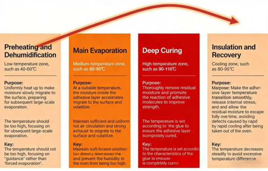 Water is the carrier of water-based adhesives and must be precisely managed during drying. A well-designed oven temperature profile ensures complete drying.A four-stage oven temperature profile is recommended, illustrated using typical parameters for F0955 adhesive: